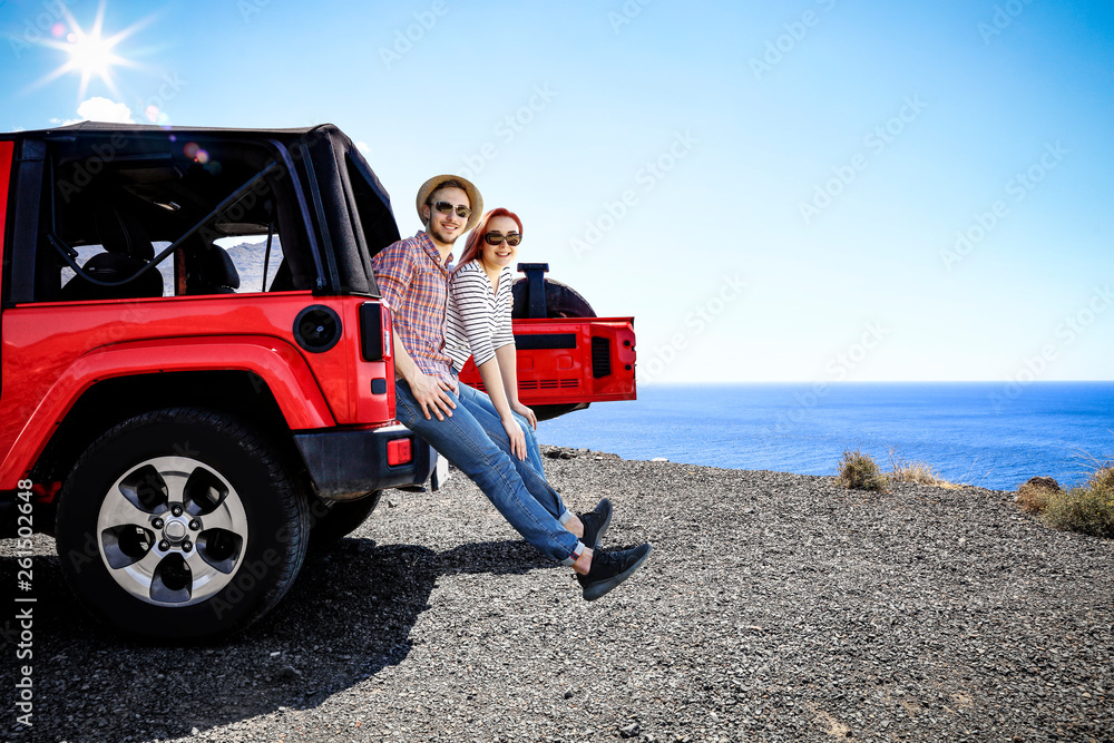 Red summer car and two people