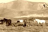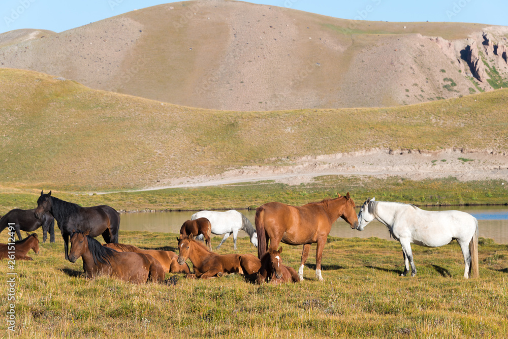 Osh, Kyrgyzstan - Aug 20 2018: Horses on the side of Tulpar Kol Lake in Alay Valley, Osh, Kyrgyzstan. Pamir mountains in Kyrgyzstan.