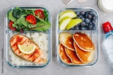 Meal prep containers with salmon, rice, green salad and pancakes, apple, blueberry.