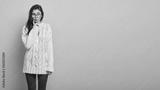 Beautiful girl wonders if she can afford little rest, stands in thoughtful pose, folds llips and touches cheek, focused away, wears long white jumper and red tights, isolated over beige background.