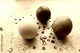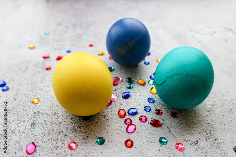 Three colorful easter eggs on wooden background with rhinestones closeup
