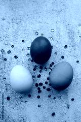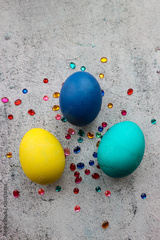 Three colorful easter eggs on wooden background with rhinestones closeup