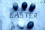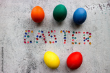 Easter wallpaper five colorful eggs and word Easter on wooden background
