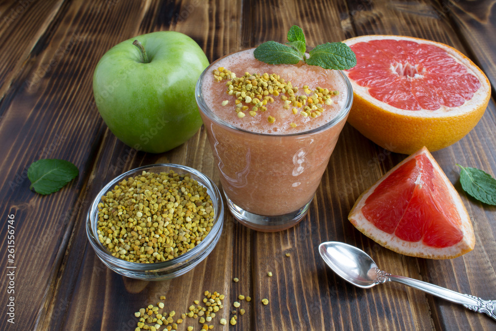 Smoothies with grapefruit, green apple and bee pollen on the brown wooden background