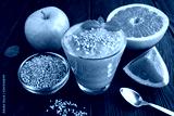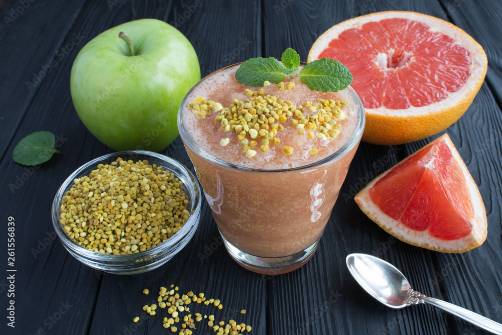Smoothies with grapefruit, green apple and bee pollen on the black wooden background