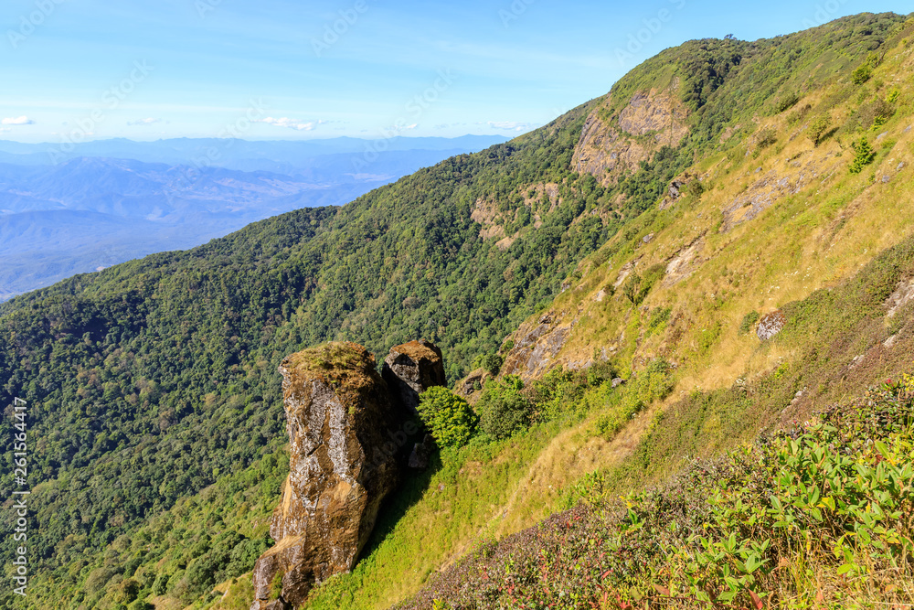 Pha Ngam Noi Cliff and valley scenery view at Kew Mae Pan nature trail, Doi Inthanon National Park, Chiang Mai, Thailand