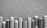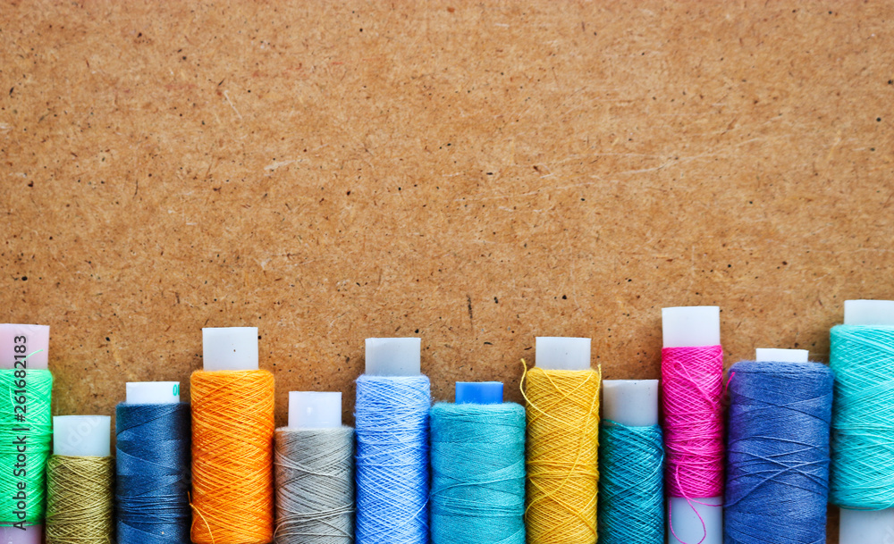 Multicolored threads on a roll for sewing on a blurred wooden background. With copy space