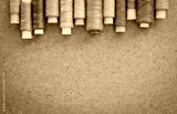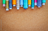Multicolor sewing threads on a roll for sewing on a wooden background. With copy space