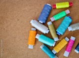 Multicolor sewing threads on a roll for sewing on a wooden background. With copy space