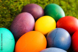 several colorful easter eggs on the green grass background closeup