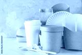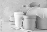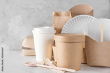 eco friendly disposable dishes made of bamboo wood and paper on white marble background. recycling concept