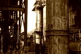 Greenery growing up through an abandoned industrial complex, peeling paint and rusted pipes, horizontal aspect