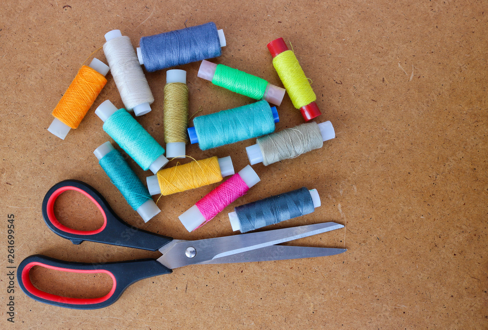 Multicolor sewing threads on a roll for sewing and tailoring scissors on a wooden background. With copy space