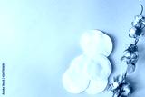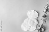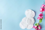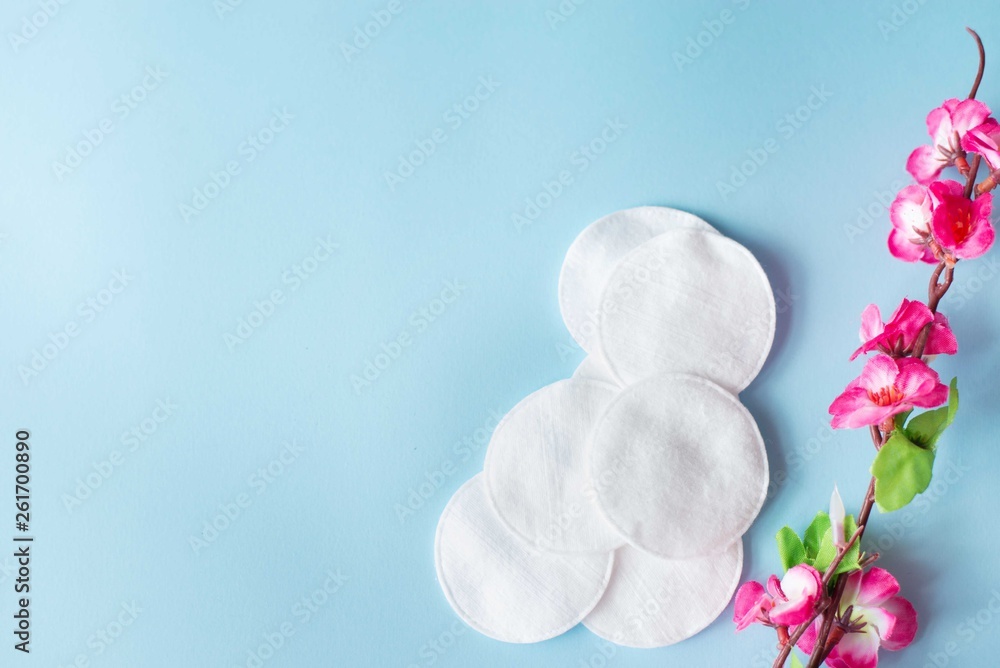 Cotton hygiene products. Cotton pads with pink flowers on blue background top view copy space