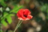 Blossoming red poppies in the field. Spring landscape and flower background. Blooming meadow with the poppies