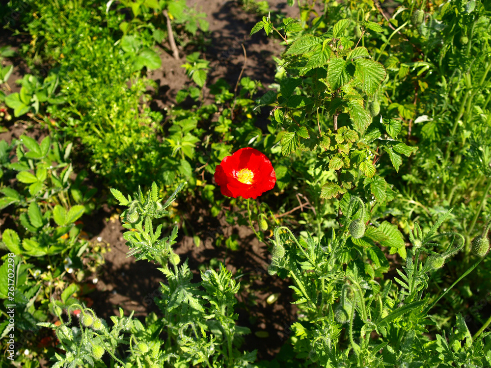 Single red poppy in blossoming in the country garden. Spring garden and flower background. Blooming garden with the poppy