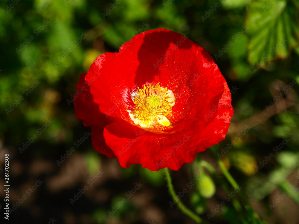 Single red poppy in blossoming in the country garden. Spring garden and flower background. Blooming garden with the poppy