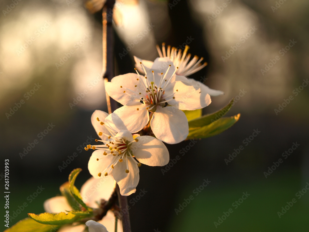 Apple tree branch with the blooming flowers in the rays of the evening sun. Spring garden in flowering
