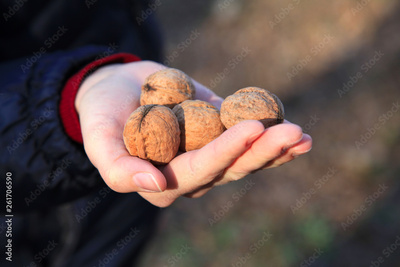 Walnuts in the palm of the hand. Food for the little squirrel in spring park
