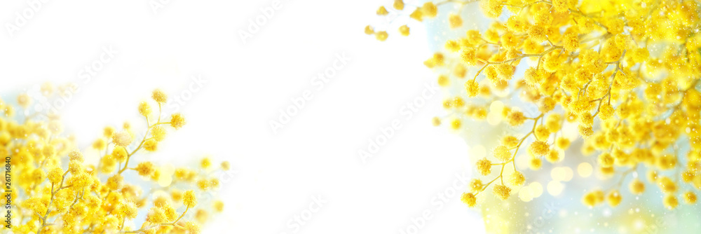 spring Mimosa flowers on white background. spring season concept. fluffy yellow mimosa, symbol of 8 March, happy women's day. copy space. banner