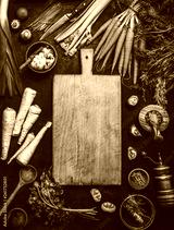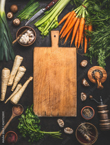 Food background with cutting board and various organic farm vegetables on dark rustic table with kitchen utensils, herbs and spices, top view. Frame. Copy space. Vegan and vegetarian food concept.