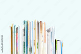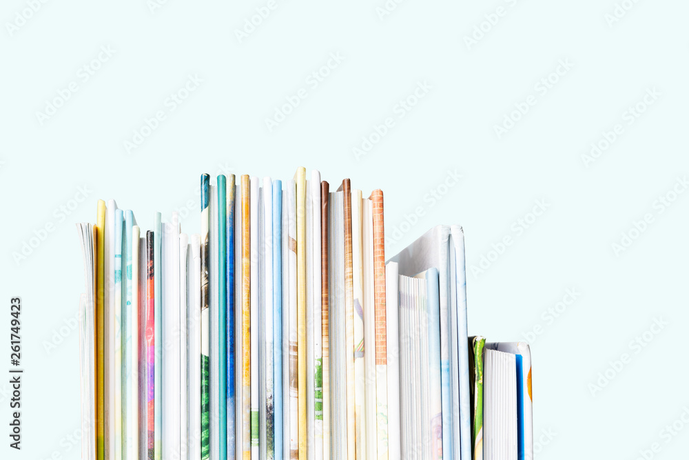 Close view of Stack of children's books on a pastel blue background.