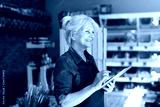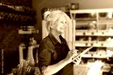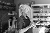 Shop assistant with digital tablet in small grocery store