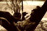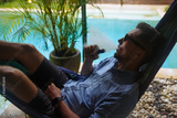 Man resting in a hammock and vaping and letting off steam from an electronic cigarette