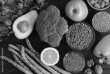 Superfood or vegetarian food concept.Vegetables,fruits,legumes,nuts and bee pollen on the black wooden background.Top view.