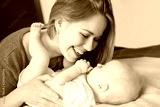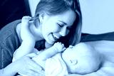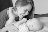 Closeup of young Caucasian woman mother hugging kissing playing with cute newborn baby boy girl child at home. Authentic candid family lifestyle. Happy motherhood and parenting.