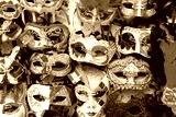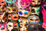 Beautiful Venetian masks background with inscription Made in Italy. Street shop in Venice Italy outdoors. Tourism and travel concept.