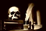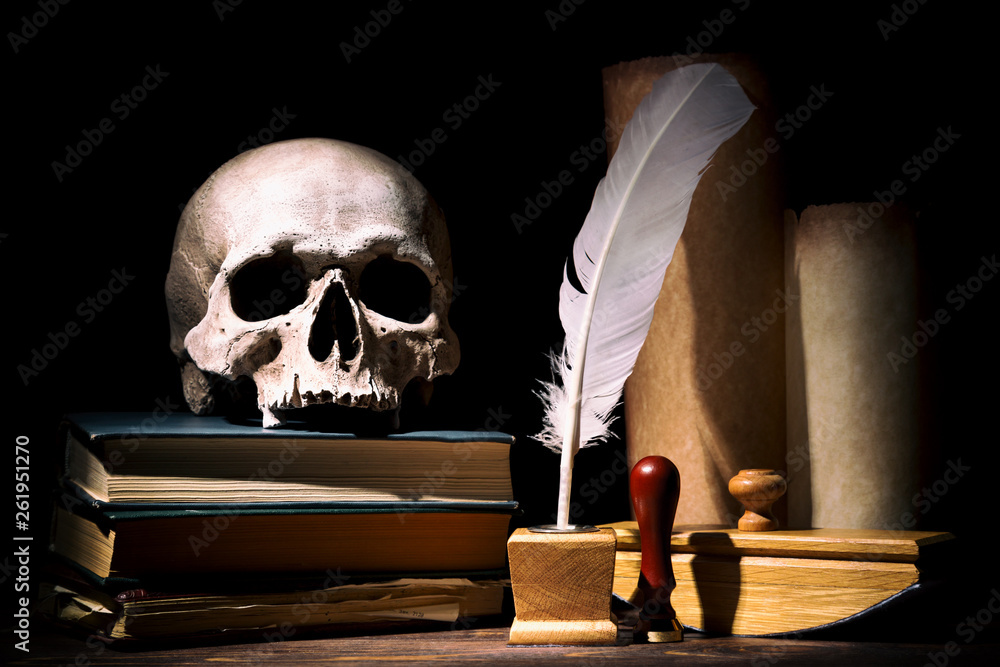 Drama or theater and literature concept. Old inkstand with feather near scrolls with skull on books against black background. Dramatic light