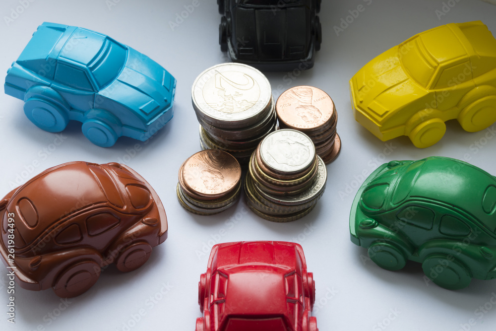 Maintenance cost for personal cars concept with colourful miniature vehicle around piles of coins