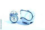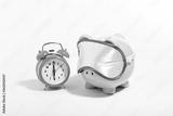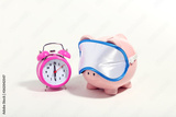 Piggybank with sleeping mask and alarm clock on white background. Minimalism concept