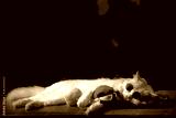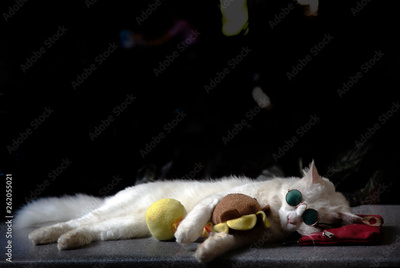real cat sleeping with rat doll and wear sunglasses