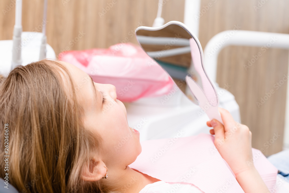 Elementary age girl looking at her teeth in the mirror in pediatric dental clinic