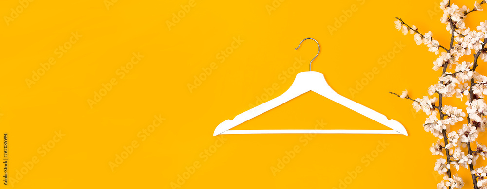 Creative fashion beauty background. White wooden hanger and spring flowering branch on yellow background. Spring sale concept discount store shopping empty hanger promo design. Flat lay top view