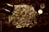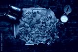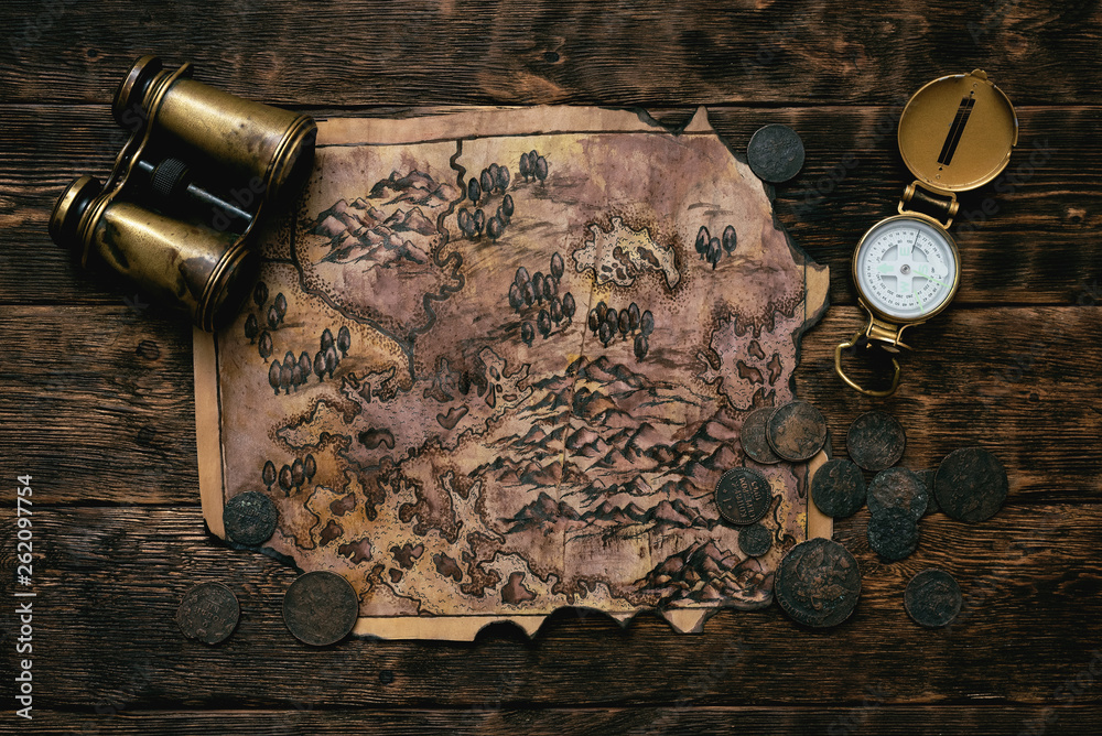 Old map, compass and binoculars on a adventurer table background. Treasure hunt concept.