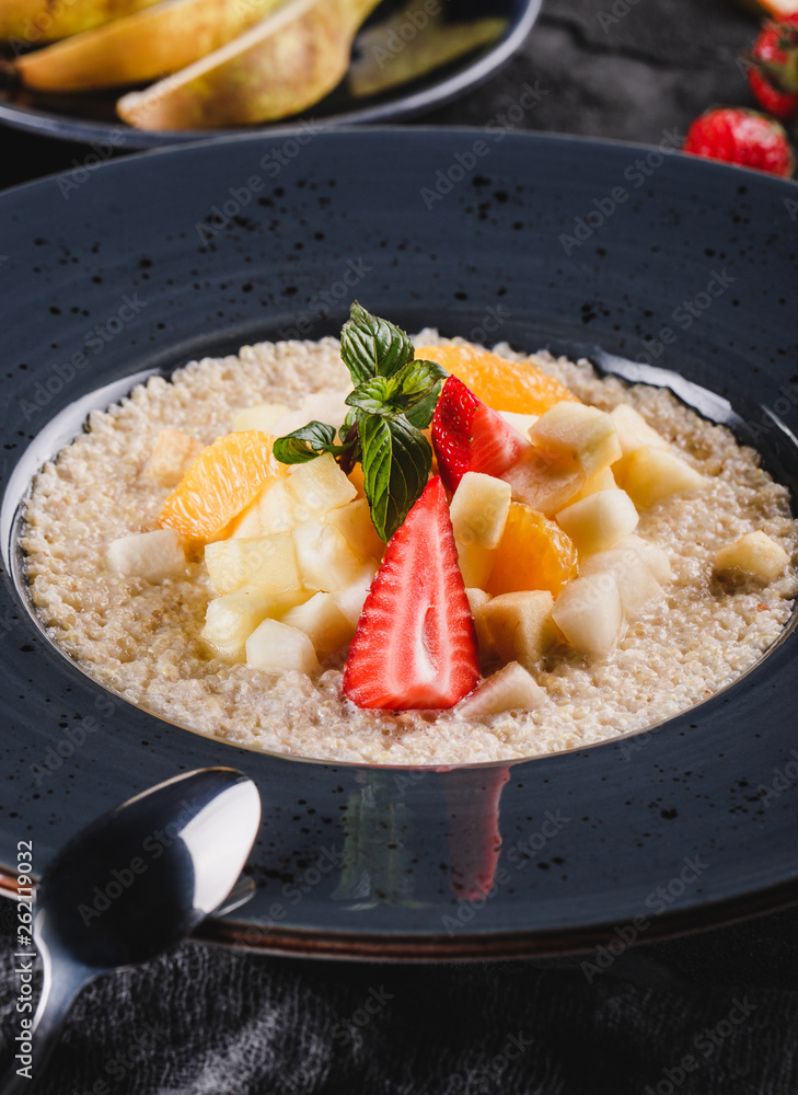 Quinoa porridge with fruits, strawberries, pear, banana and coconut milk in plate over grey background. Healthy breakfast. Clean eating, vegan food concept, close up