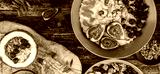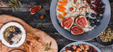 Rice coconut porridge with figs, berries, nuts, dried apricots and coconut milk in plate on rustic wooden background. Healthy breakfast ingredients. Clean eating, vegan food concept, top view