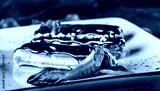 Homemade cake eclairs or profiteroles with custard, chocolate and strawberries on dark background served with cup of coffee. Traditional french eclairs, dessert. Close up