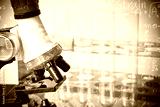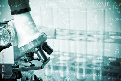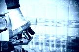 microscope and laboratory test tube on light blue background , science research equipment concept.
