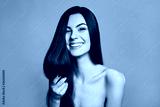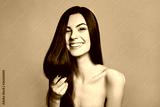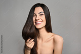 Portrait of beautiful young woman with healthy long hair on grey background