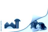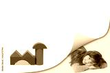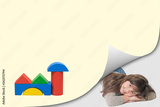 Blank page with curl effect and smiling cute little girl lying in an exposed corner looking at the camera. Blank page and a building of colorful wooden shapes are ready for your text