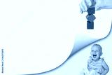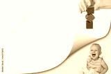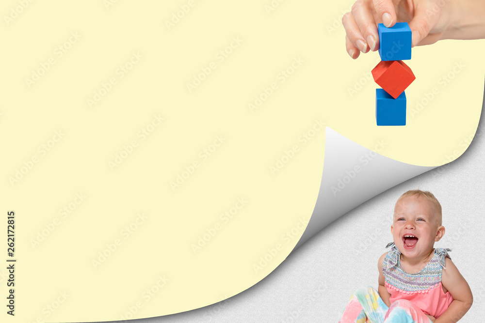 Creativity concept showing page with curl effect and laughing toddler girl sitting in an exposed corner. Hand holding stacked colorful wooden cubes is over her.