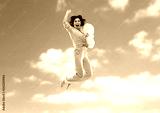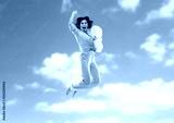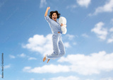 fun, people and bedtime concept - happy young woman full of energy in blue pajama holding pillow and jumping over blue sky and clouds background