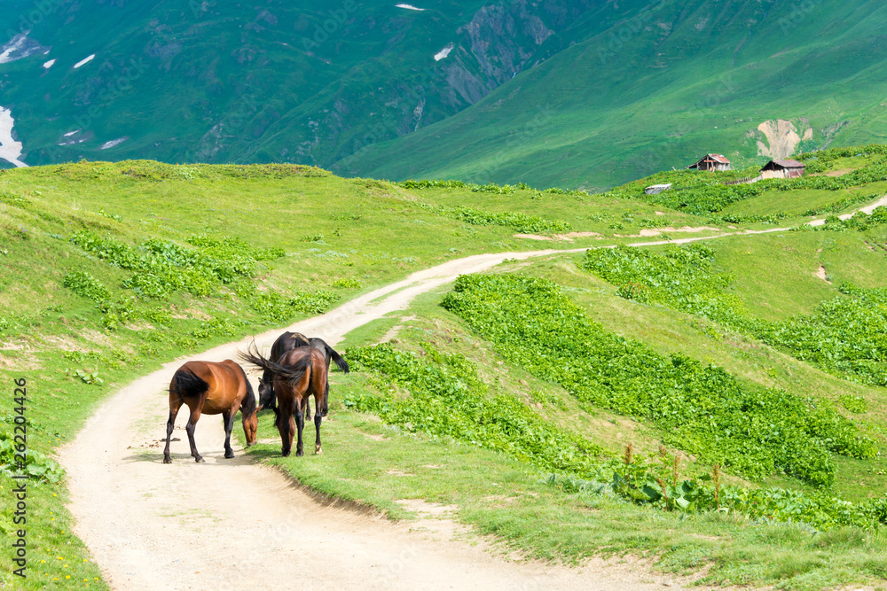 Mestia, Georgia - Jun 25 2018: Hiking trail leading from Mestia to Koruldi lakes. a famous landscape in Mestia, Samegrelo-Zemo Svaneti, Georgia.