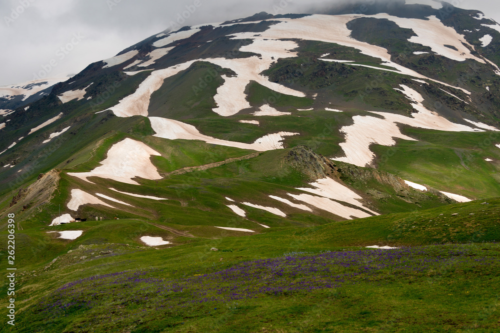 Mestia, Georgia - Jun 25 2018: Hiking trail leading from Mestia to Koruldi lakes. a famous landscape in Mestia, Samegrelo-Zemo Svaneti, Georgia.