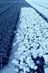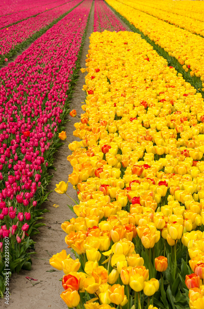 flower field in springtime near Noordwijkerhout, The Netherlands, with strips of purplish red tulips and yellow tulips with some red and orange