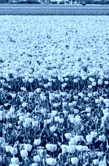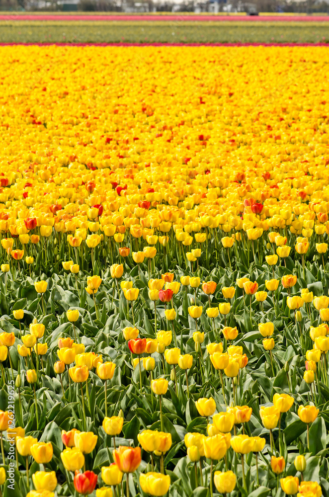 Flower field in springtime near Noordwijkerhout, The Netherlands with mainly yellow and some red and orange tulips